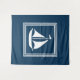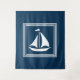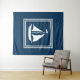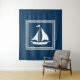 Nautical themed design with sailing boat decoration in striped squares on blue background