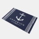 Anchors away! Greet your guests with this statement making white nautical anchor doormat.. The background is a dark navy blue colour with personalised family name text in white. This doormat is elegant, chic, and would make a great impression on your house guests as they are welcomed to your home!