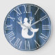 Fun nautical style faux blue wood and white merman holding two tridents with white numerals round clock.