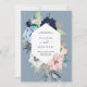 This stylish and trendy wedding invitation features a modern geometric frame with nautical coloured watercolor flowers. Hydrangea, peony, and anemone flowers appear in shades of navy blue, light blue, and blush pink with green and neutral beige leaves. The background of the card is a dusty blue colour, and the back of the card is dark, navy blue.