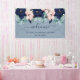 This stylish and trendy wedding banner features a nautical colored watercolor floral design. Peony, and anemone flowers appear in shades of navy blue and blush pink with green eucalyptus leaves. The background is a soft dusty blue color. Modern script typography says "welcome", making this banner perfect for any celebration including bridal showers, baby showers, graduations, and weddings.