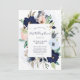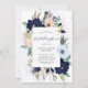 This stylish and trendy post-wedding brunch invitation features a modern rectangular frame with nautical coloured watercolor flowers. Hydrangea, peony, and anemone flowers appear in shades of navy blue, light blue, and blush pink with green and neutral beige leaves, along with starfish. The background of the card is decorated with a pale blue watercolor wash and splashes, and the back of the invitation is a dark navy blue. Perfect for an after wedding reception or newlywed luncheon.