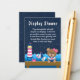 This cute and fun display shower enclosure card features a nautical sailor girl bear on a wooden deck with a seagull and a crab. In the background there is a pink and white lighthouse, a cute bird on a sailboat, ocean waves and a navy blue starry night sky. The text combines bold and serif fonts for a stylish and modern look. This is perfect for a nautical themed baby shower.