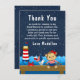 This cute and fun thank you card features a nautical sailor girl monkey on a wooden deck with a seagull and a crab. In the background there is a red and white lighthouse, a cute bird on a sailboat, ocean waves and a navy blue starry night sky. The text combines bold and serif fonts for a stylish and modern look. This is perfect for a nautical themed baby shower.