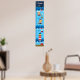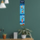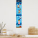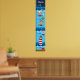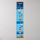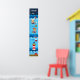 This cute and fun height chart features nautical sailor girl monkeys, a sailboat, seagull, ship wheel, bird, crab and a red and white lighthouse. In the background there are ocean waves and a navy blue starry night sky.
