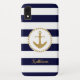 This nautical phone case with navy blue and white stripes and an anchor inside a rope-look circle in golden colours is personalised with a name template. This girly design is a lovely custom gift idea.