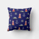 Nautical icons, lighthouse, silver grey anchor and ship wheel on navy blue Throw Pillow.