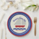 Patriotic holiday paper plate with nautical twist. Sailboat on a red white and blue circle background. Edit optional text to fit any summer holiday picnic or nautical themed occasion. Get other coordinating mix or match items in this design collection at www.zazzle.com/pinkladybugs