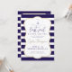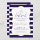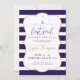 A simple, modern, elegant and chic nautical bachelorette party invitation template featuring an ink print of a water scene with ocean waves, a boat and seagulls, as well as a bracket frame over dark navy blue stripes. A lovely choice for a beach bachelorette weekend, a coastal bachelorette weekend, a lake, water edge bachelorette weekend or a boat or yacht bachelorette weekend.