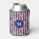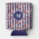 Nautical can cooler with sailing boat lifebelts over navy blue and white stripes. There's a monogram circle on the front and back to add your own initial