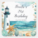 Beautiful birthday party sticker with a nautical black and white lighthouse, starfish and shells. Perfect for a birthday party. The words can be changed to suit your own details or requirements