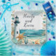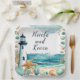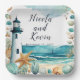 Beautiful wedding plates with a nautical black and white lighthouse, starfish and shells. Perfect for a wedding. The words can be changed to suit your own details or requirements