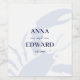 Nautical lobster wine labels with bride and groom names and date. Large lobster with classic navy blue block text.