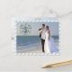 Perfect complimentary holiday card for the newlyweds to announce or share nautical or beach themed wedding or honeymoon photos. The postcard features a steel blue green anchor and the words MERRY & MARRIED in a blue green handwritten brush script font against a light blue-green and white striped background. The back side has a full-bleed photo frosted over for easy reading. You can change the sample "Happy Holidays" to your own greeting and change or delete the sample message.