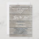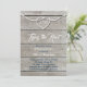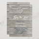 A white rope tied in a heart and navy and white type, decorates this rehearsal dinner invitation on a sun bleached wood board background, making it perfect for the nautical themed wedding.
