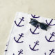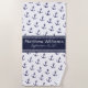 Simple yet striking this beach towel features a nautical navy blue anchor patterned background with a stylish area to add your name or a message of your choice.