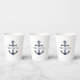 Personalised nautical paper cup featuring a navy blue anchor design and your custom family name in a classic serif font.