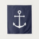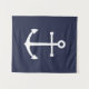 Modern Minimalist Nautical Tapestry featuring white anchor on navy blue background.