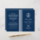 Elegant wedding ceremony program includes a boat anchor with tied rope monogram and stripe detail where the programs should be folded. Personalise the white custom text on the front and inside pages with your ceremony information and thank you message. Note: these text weight paper programs arrive flat and require folding to assemble. The navy blue background can be customised.