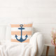 Stylish and chic square accent pillow design features a beachy white and peach orange cabana striped pattern with navy blue boat anchor. The pastel peach orange background colour can be customised.