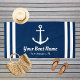 Nautical beach towel in a horizontal format features an elegant boat anchor with preppy horizontal stripes. Personalise the custom text with your boat name and location. Design includes a classic coastal navy blue and white colour scheme.