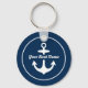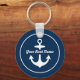 Round nautical keychain design features a simple, stylish navy blue and white coastal style design with boat anchor accent. Personalize the custom script text with the name of your boat.