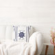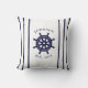 Navy blue and white nautical pillow with a family name and year to personalise it for coastal style home decor. This pillow is decorated with a dark navy blue stripes in different sizes on a front side and a backside. Steering wheel decorates one side of the pillow, so you can vary the decor of the room just by turning this nautical pillow. Use the template to type a name and year estimated.
