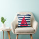Navy blue and white striped decorator throw pillow designed with a red boat and personalised with your name in a modern script font. Perfect addition to your beach home decor.