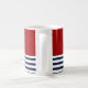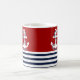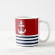 Stylish decorative mug features a nautical navy blue and white stripes with a blue anchor vector illustration on a red background you can easily change the colour. Matching items available in our store. www.zazzle.com/giftsforanyoccasions