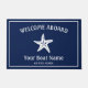 A nautical style "Welcome Aboard" boat mat. With a navy blue background, there is white border and in the middle, a white image of starfish. Above, in modern white typography is "Welcome Aboard" and underneath you can easily customise with your boats name as well as location.