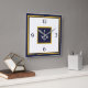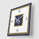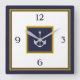 Nautical white, navy blue and yellow anchor square wall clock. White anchor within a navy blue square at center, navy blue text and on a white backgorund outer with yellow double lined borders.