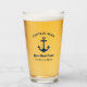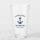 A nautical beer glass featuring a navy blue anchor with custom captain name arched above, boat name in script, and home port location beneath. The crisp navy badge-style design makes this a sharp addition to any boat galley or waterfront bar. A fantastic personalised gift for boat captains, fishing enthusiasts, or sailing lovers. All text is fully customisable.