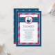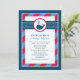 This cute nautical baby shower invitation features a friendly navy whale with heart-shaped water splashes, set against a bold navy blue and red polka dot and stripe design. The classic nautical colour combination is perfect for a baby boy celebration. A coordinating whale pattern dresses up the back of the card. All wording is fully customisable for your event.