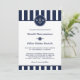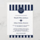 Preppy nautical wedding invitation featuring a cute modern anchor, navy blue and white stripes, and space for the bride and groom's first initials at the top of the invite.