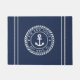 Welcome guests aboard your fishing boat, yacht, sailboat, or houseboat with this awesome personalized mat. Nautical design features your boat name and ship's registry curved inside a rope badge with a white anchor inside. Rope stripe detailing in white on a navy blue background completes the look.