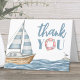 Thank you card with a nautical twist! The front of the folding card features the words "Thank You," with a red life saver cleverly placed inside the "O" in "You." A blue and white sailboat floats in the middle of a soft blue ocean, with a cute seagull perched on a rock nearby, bringing a charming and playful touch to the design. Rope accents and water details complete the seaside vibe.