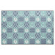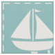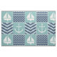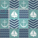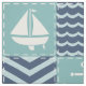 A quilt inspired pattern of stormy turquoise squares, decorated with a white sailboat and anchor, and deep navy blue squares, accented with paler blue chevrons and waves, is accented by white stitching to create a classic nautical feel.