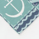 A quilt inspired pattern of stormy turquoise squares, decorated with a white sailboat and anchor, and deep navy blue squares, accented with paler blue chevrons and waves, is accented by white stitching to create a classic nautical feel.