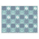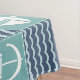 A quilt inspired pattern of stormy turquoise squares, decorated with a white sailboat and anchor, and deep navy blue squares, accented with paler blue chevrons and waves, is accented by white stitching to create a classic nautical feel.