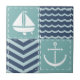 A quilt inspired pattern of stormy turquoise squares, decorated with a white sailboat and anchor, and deep navy blue squares, accented with paler blue chevrons and waves, is accented by white stitching to create a classic nautical feel. This tile can be framed to create a trivet or placed inside a wooden gift box lid. Tiles without a frame will also fit inside the large gift box to create a matching set.