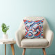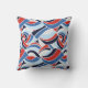 This throw pillow features an illustrated, abstract design that resembles ocean waves. The colours are shades of red, white and blue and the design is a flowing, repeating pattern. Perfect for beachy, coastal or nautical theme decor.