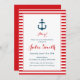 Modern Baby Shower Invitation featuring a red striped background and anchor illustration.