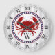 A simple nautical red crab design with a sliver grey / grey striped background.A Great customisable clock for summer time or any marine themed place. With the option to personalise a monogram, could be the family initial or your own.