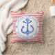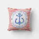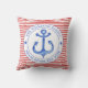 NewparkLane - Nautical Throw Pillow, with a red and white striped pattern and a navy blue anchor in a circular white frame. Add your family name or other personal text in the frame around the anchor.