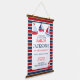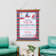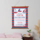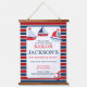 Cute boy's nautical theme 1st birthday party (or any birthday) hanging tapestry welcome sign with three sail boats, an anchor on a white frame and navy and red striped background. Personalise the text yourself when you order. Fun decoration for nautical theme birthday. Change the text to any event or occasion.