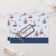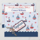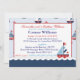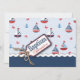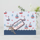 Nautical theme baptism invitation card with sailboats, crabs, and anchors with a 3D-look twine bow and tag.