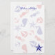 A fun combination of seahorse, sailboats, whales, anchors and stars. Background objects are red and blue.
