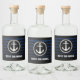 Set of 6 personalised Liquor bottle labels featuring a custom nautical sea anchor with your captain title or other rank, your name and boat name or your desired text in white with navy blue and Black Stripes.