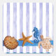 Original watercolor painted design by Sandra Gale, featuring star fish, sea horse, turtle and shells on a background of vertical translucent blue stripes. Great design for the summer, beach homes, bungalows or for anyone who loves the beach, ocean or fish.