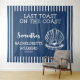 personalized nautical coastal theme bachelorette party tapestry in navy blue and white with a shell and a pearl is perfect as a bachelorette party photo backdrop. With the slogan "last toast on the coast". Celebrate your bridal shower in style with the perfect nautical beach party theme, the perfect theme for the nostalgic vintage sailor bride and her bridesmaids.